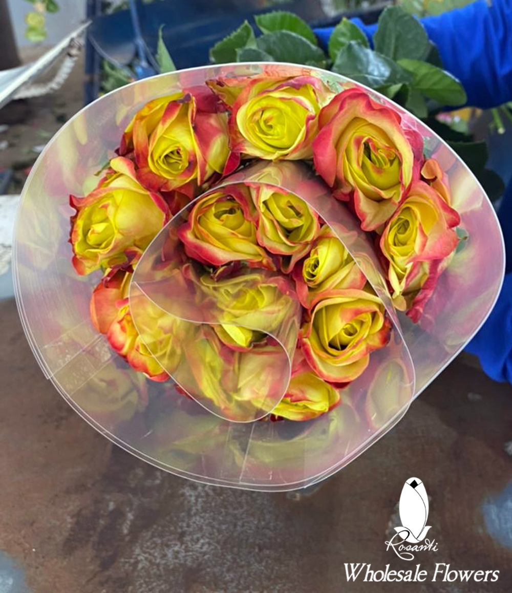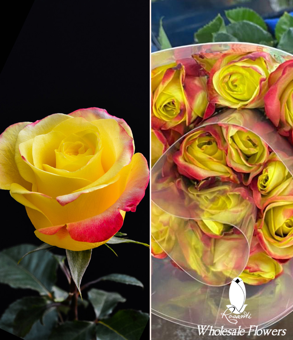 Every rose has been specially selected to spread love and kindness. There is no better way to show your affection in summer and hot days with the contrast of our two beautiful bicolor yellow roses with hot pink trim and impressive bloom to make this the perfect combination for such a special day. Since time began, the rose has been symbolic for many things, but the most notable meaning as the messenger of love, affection, and companionship.
